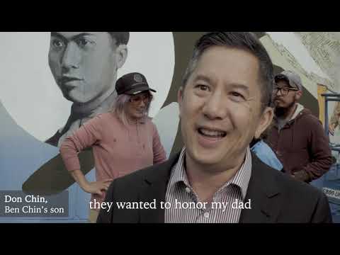 Artist, Dave Kim, explains “I wanted to use the duck as the primary symbol, elevate the fowl that was used by the white majority derogatorily. Taking the colorful Mandarin duck native to China - which traditionally represents wish for happiness; loyalty - as they mated for life; wish for children and young love - to symbolically offer back to the past residents the things they sacrificed - being relegated as second class, being oceans away from potential partners. Eureka had a population of 20 women to 200 men.” The yellow background represents the prospect for gold, the photo of historic Chinatown is imposed in the middle half of the mural and the photo of Ben Chin in his U.S. military attire represents the arrival of a new wave of Chinese and Asian/Pacific Islanders to the area after the 1950s. The red sun represents the passing of time and the Chinese characters translate as “home”.
